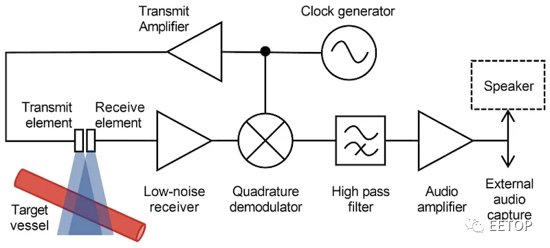 多普勒传感器的功能框图 该设备测量频移;接收回波的频率与发射波束的频率进行比较。频率变化(称为多普勒频移)与朝向或远离换能器的运动速度成正比。使用这种方法,贴片可以检测到在两个光束的重叠体积内移动的任何地方的血液。 该贴片产生的超声波束比颈动脉宽很多,这样医护人员就可以在相当大的容忍度下轻松地将设备放置在颈动脉上。贴片附着在颈部,无需手动操作,可实现超声光束和动脉之间的一致定位和对齐,实现高度精确的测量,几乎无需人工干预。 测量深度为14厘米 2021 年 7 月,来自加州大学圣地亚哥分校 (UCSD) 的研究人员公布了他们自己的 软超声皮肤贴片。 与北安大略省研究人员开发的设备一样,UCSD的贴片使用超声波技术来监测血流以及相关的血压和心脏功能。正如发表在《自然》杂志上的一篇论文所描述的那样,这种免手持式贴片可以测量深达身体14厘米的信号,提供极其准确和可靠的测量。