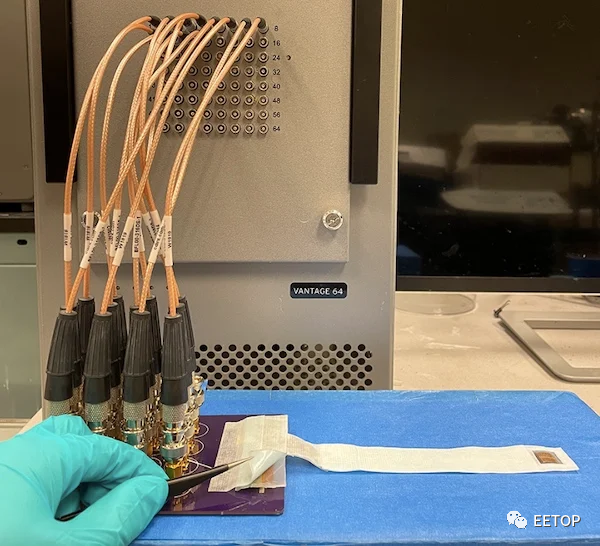 超声波可穿戴设备连接到其完整的实验装置。图片由UCSD提供 该贴片由一层可拉伸的聚合物薄片组成,可粘附在皮肤上并佩戴在颈部或胸部。该贴片与超声相控阵集成在一起,这是一个 12 x12 的微型超声换能器阵列,每个都单独控制。该阵列还测量反射超声波束的多普勒频移,以直观地记录血流。 该贴片有两种操作模式。首先,相控阵同步发射超声波以产生高强度、聚焦的超声波束,提供高深度测量。在另一种模式下,阵列和换能器传输不同步,允许超声波束转向和角度测量。 48 小时持续监控 可穿戴超声的最终和最新发展来自麻省理工学院,麻省理工学院于 2022 年 7 月宣布推出邮票大小的超声贴纸,用于体内监测。 该装置包括由围绕中间水凝胶层的两层弹性体薄层制成的粘合剂层。每一层都具有独特的功能:底部弹性体层设计用于粘附在患者皮肤上,而顶层则粘附在刚性传感器阵列上。与北安大略的研究一样,麻省理工学院的设备利用多普勒频移来检测底层血液的运动。